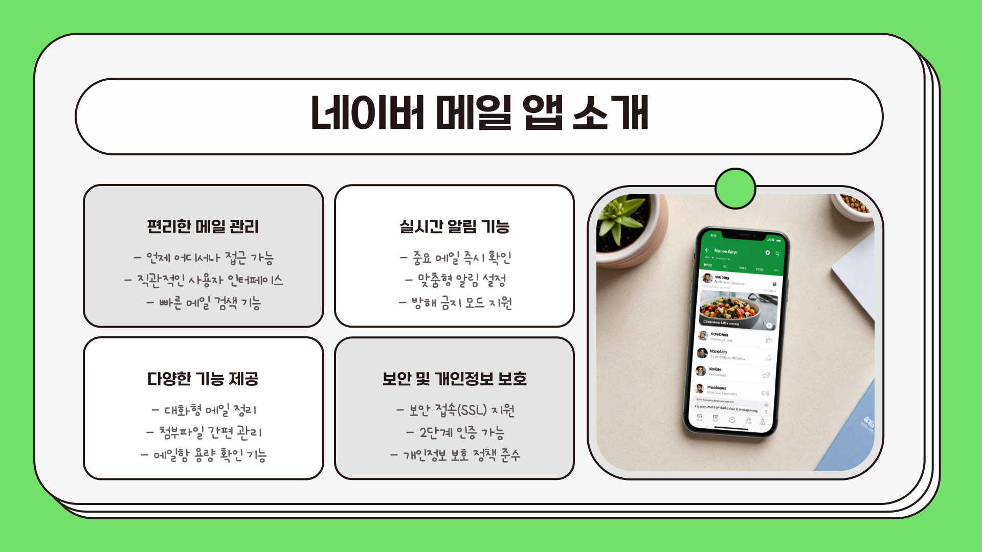 모바일에서는 네이버 메일 앱을 설치하면 언제 어디서나 실시간으로 메일을 확인할 수 있어요. 앱에서는 알림 설정, 대용량 첨부, 자동분류, 외부 메일 연동 등 다양한 기능을 간편하게 사용할 수 있습니다.