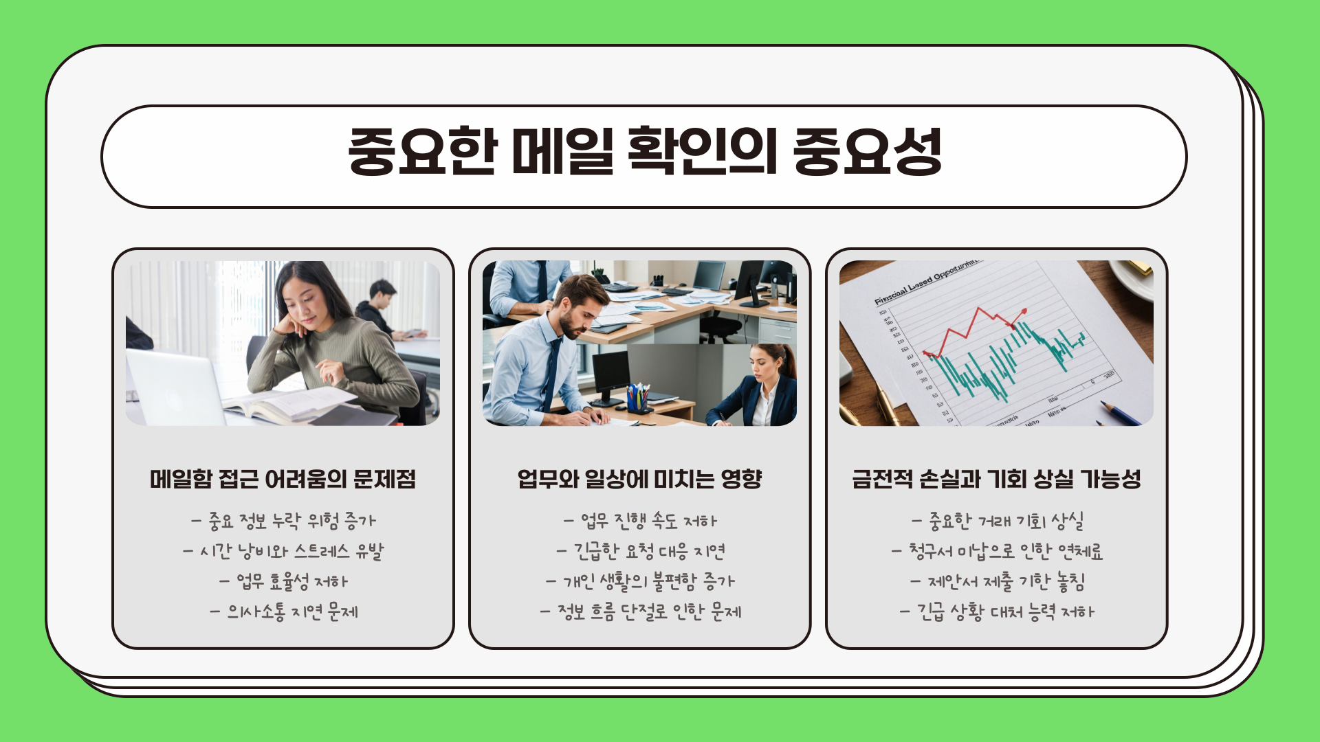 중요한 메일을 제때 확인하지 못해 곤란했던 적 있으신가요? 메일함을 쉽게 찾지 못하면 업무나 일상에 큰 지장이 생길 수 있어요. 특히 놓친 메일 한 통이 금전적 손실이나 중요한 기회를 잃게 만들 수도 있습니다.