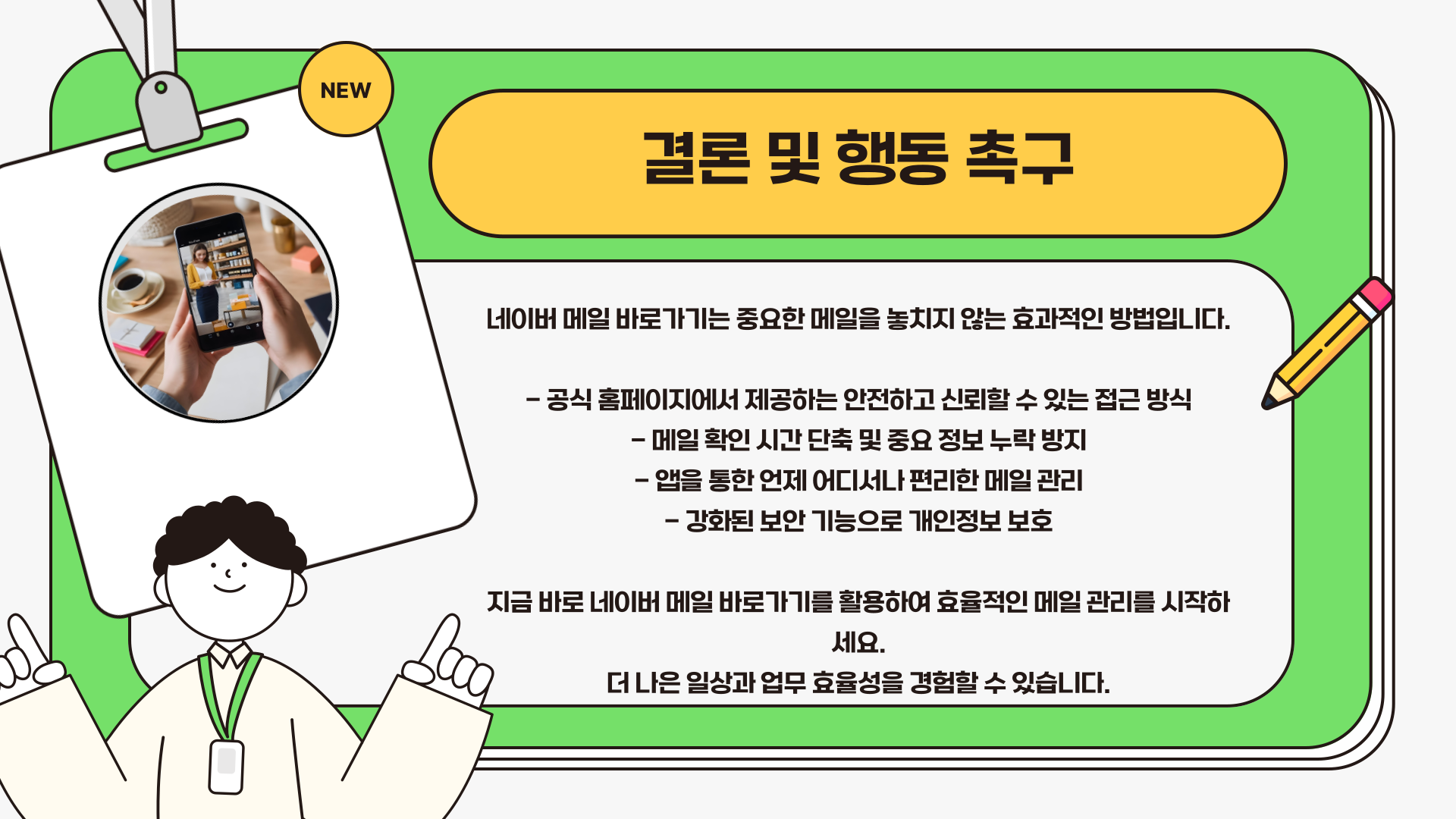 네이버 메일 바로가기를 활용하면 시간 절약, 효율적 관리, 보안 강화까지 모두 누릴 수 있어요. PC에서는 바탕화면이나 브라우저 즐겨찾기에 바로가기를 추가해 한 번의 접속으로 메일함을 확인 할 수 있습니다. 모바일에서는 네이버 메일 앱을 설치하면 언제 어디서나 실시간으로 메일을 확인하고, 첨부파일 전송이나 알림 등 다양한 기능을 편리하게 사용할 수 있죠.