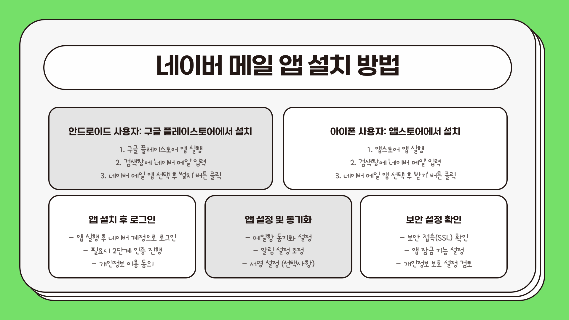 | 모바일 앱 바로가기 | 1. 구글 플레이스토어(안드로이드) 또는 앱스토어(아이폰)에서 네이버 메일 앱 설치 2. 앱 실행 후 로그인 3. 홈화면에 앱 아이콘 고정 |
