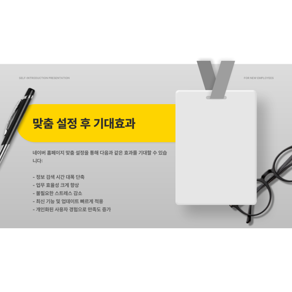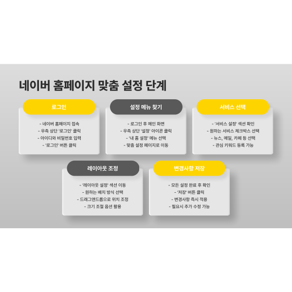 오늘 단 5분만 활용해 네이버 홈페이지를 내 스타일로 바꿔보세요. 원하는 정보와 서비스를 한눈에 확인하며, 하루 10분의 여유와 편리함을 직접 느껴보실 수 있습니다.