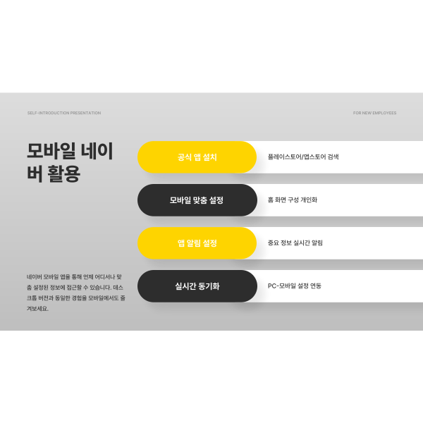 모바일에서도 네이버 홈페이지의 구조와 주요 메뉴는 거의 동일하게 제공됩니다. 공식 홈페이지에서 직접 메뉴를 눌러보며 구조를 익혀보시고, 안드로이드는 구글 플레이스토어, 아이폰은 앱스토어에서 네이버 앱을 설치하면 언제 어디서나 동일한 환경에서 편리하게 이용할 수 있습니다.