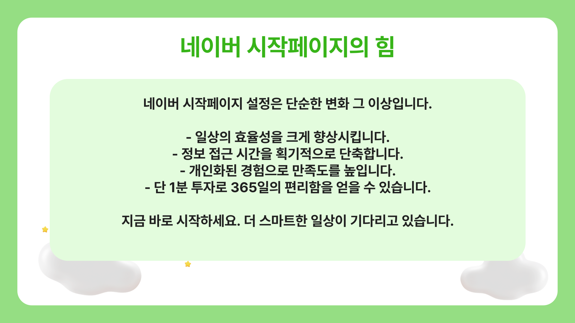 오늘부터 네이버를 시작페이지로 설정해두면, 더 스마트하고 효율적인 하루가 자연스럽게 만들어질 거예요. 네이버 홈페이지에서 직접 그 변화를 느껴보세요.
