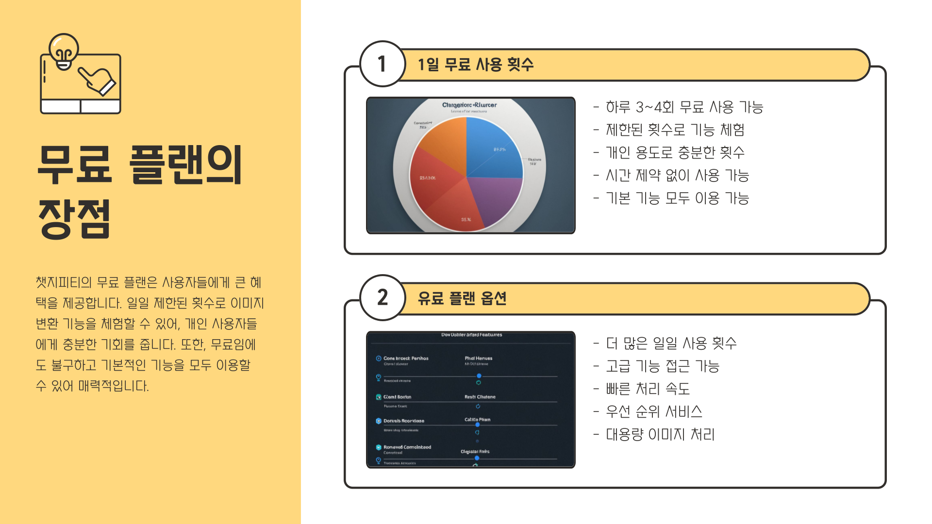 | 챗지피티 플러스 플랜 | 유료 플랜으로 더 많은 생성 횟수와 고해상도, 다양한 옵션 지원 | 속도·퀄리티 향상, 이미지 옵션 다양화, 제한 없는 창작 가능 |