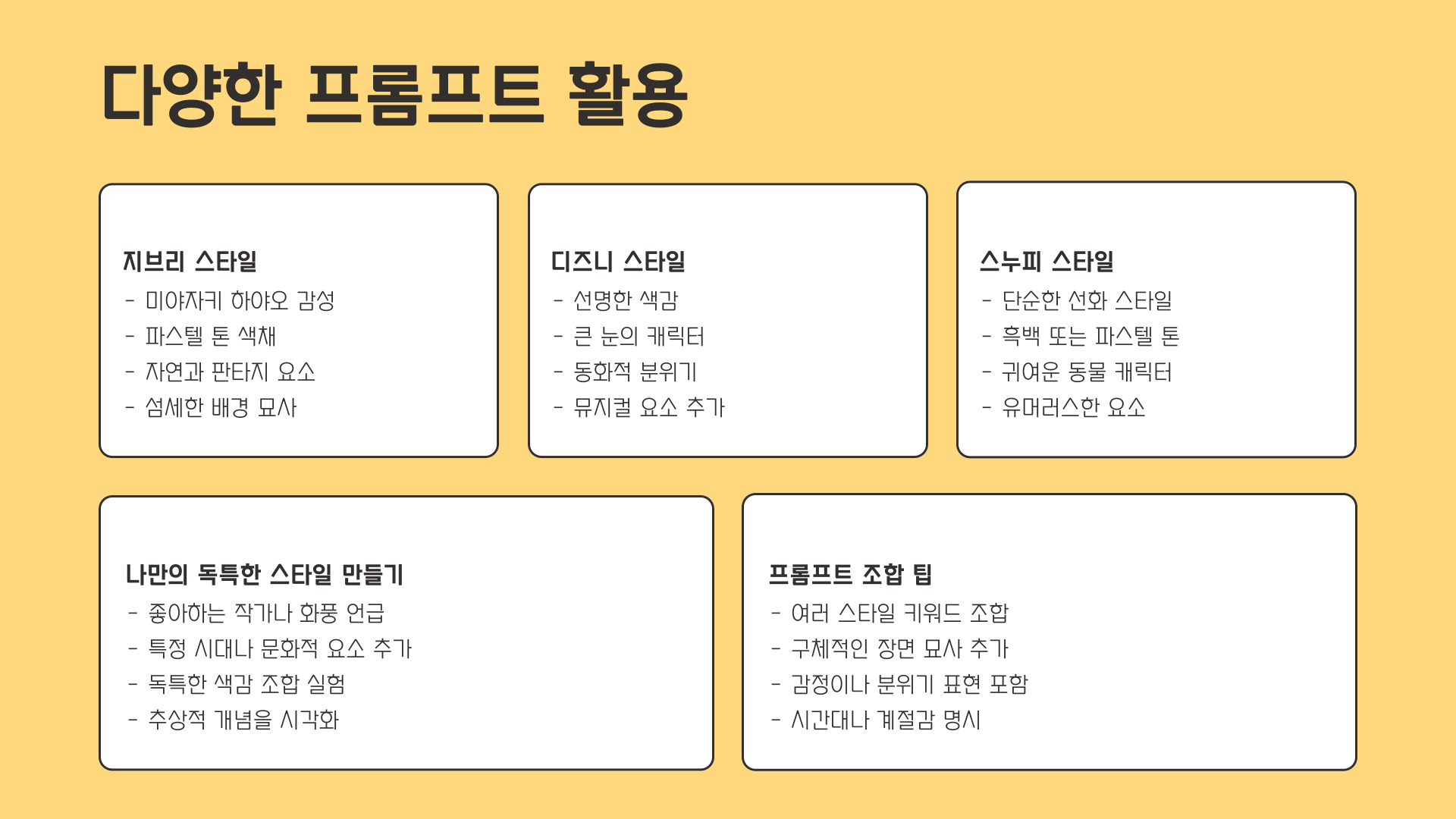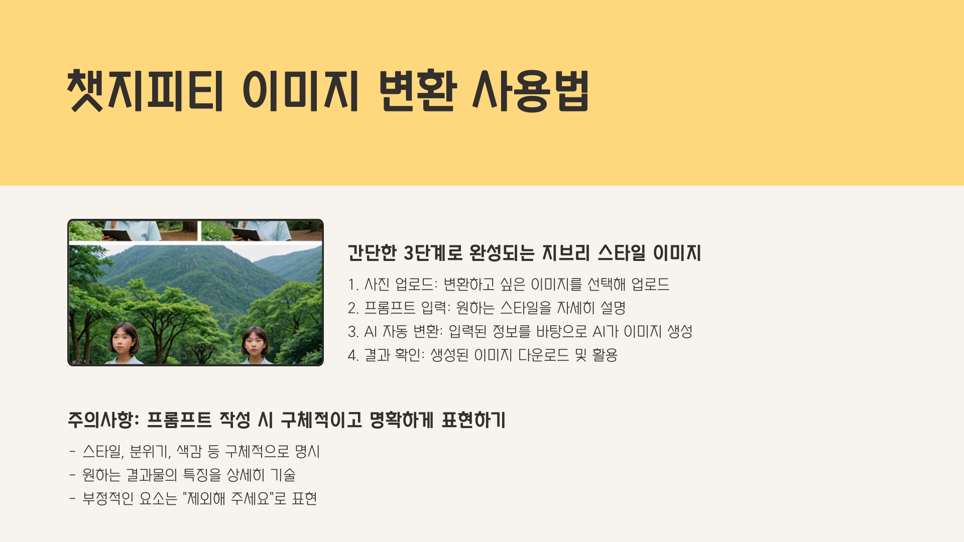 | 챗지피티 프롬프트 활용 | 지브리 스타일을 구체적으로 프롬프트로 입력해 이미지 생성 요청 | 내가 원하는 장면, 분위기, 색감 등을 자유롭게 반영 가능 |