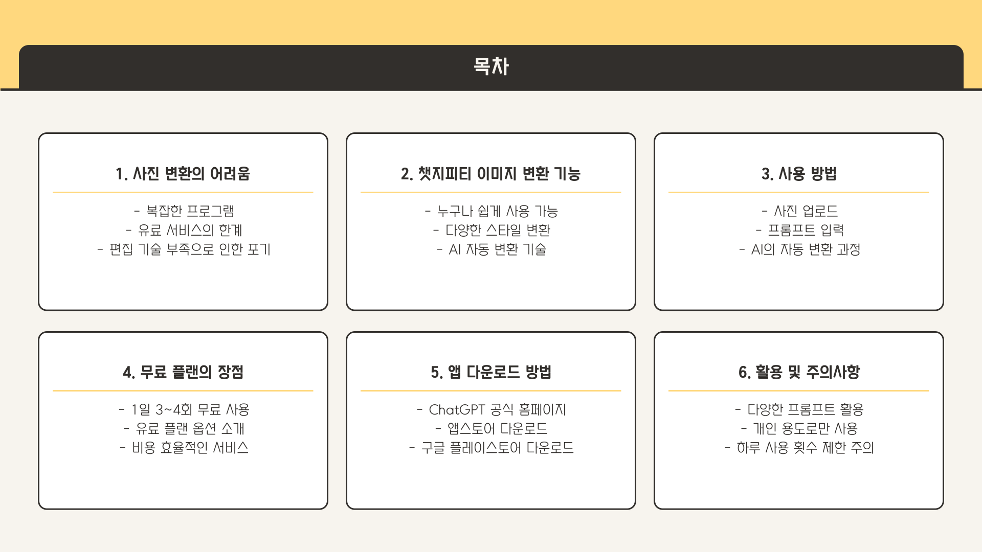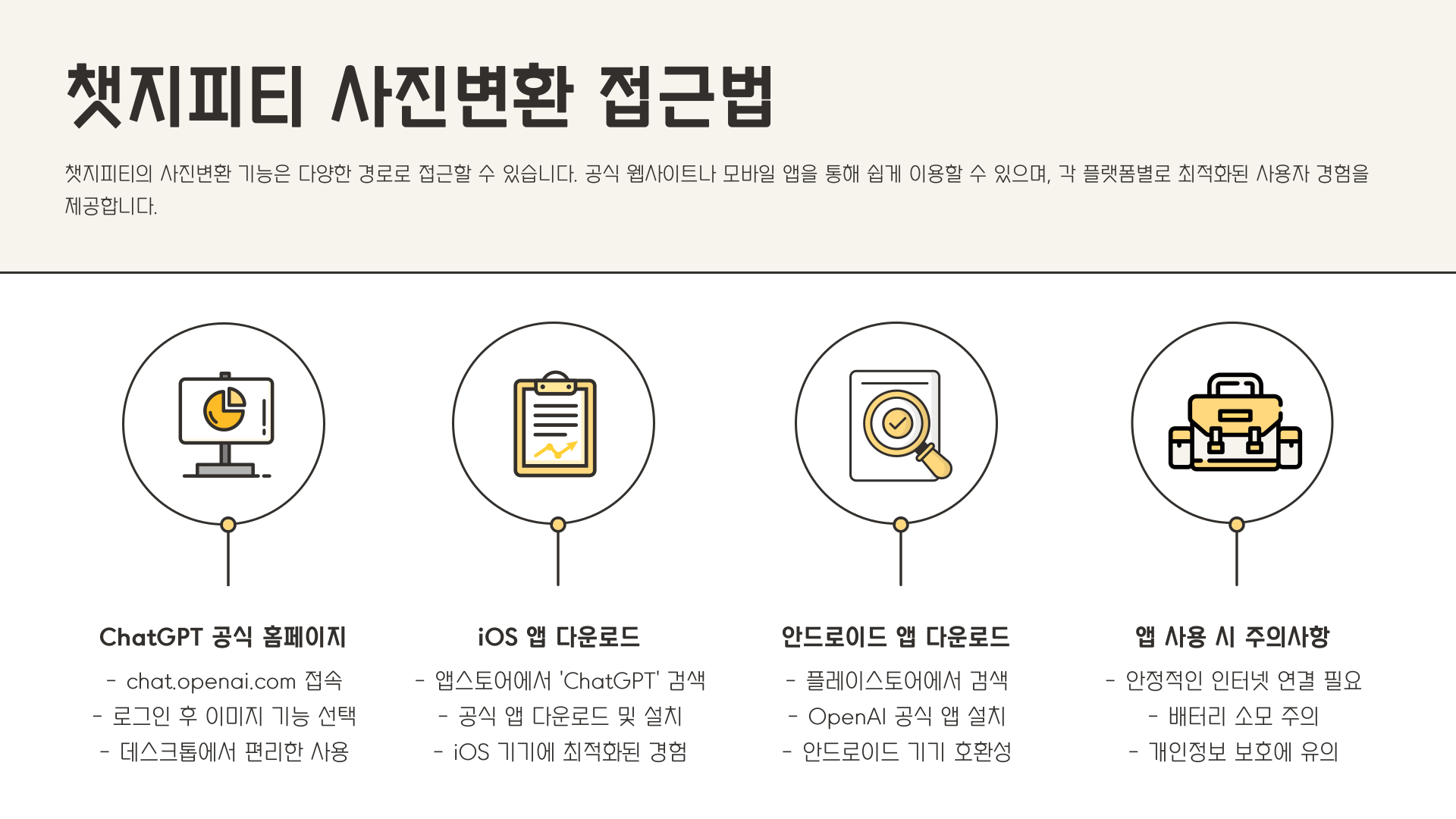 | 챗지피티 모바일 앱 활용 | 챗지피티 공식 앱에서 사진 업로드 또는 프롬프트 입력으로 바로 생성 | 언제 어디서나 쉽고 빠르게 지브리풍 이미지를 만들 수 있음 |