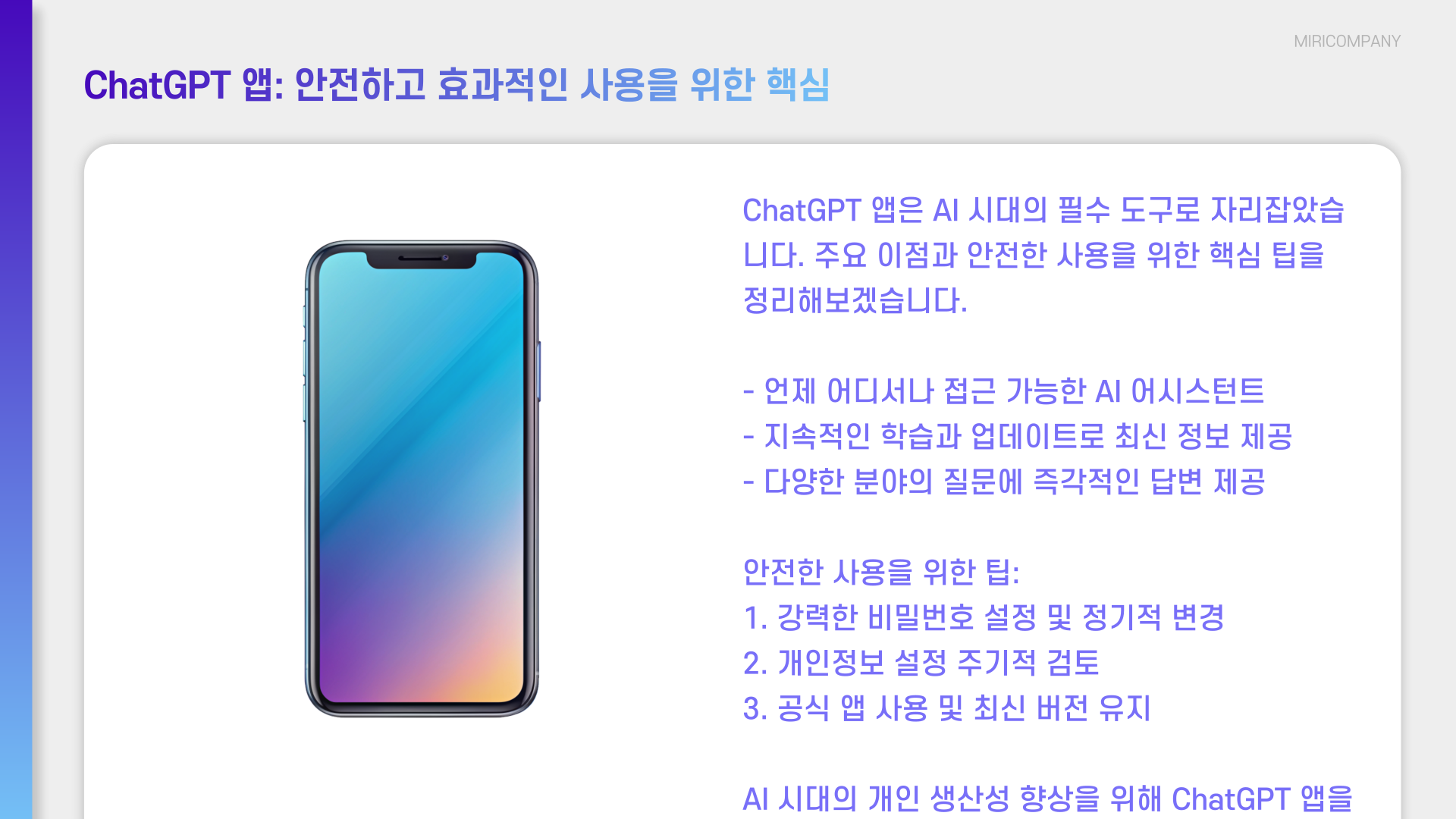 - 주의할 점은, 챗 gpt가 제공하는 정보는 참고용이기 때문에, 중요한 결정이나 민감한 정보는 반드시 추가로 검증해야 해요. 저도 업무상 중요한 데이터는 AI 답변과 함께 공식 자료를 꼭 확인하고 있어요.
