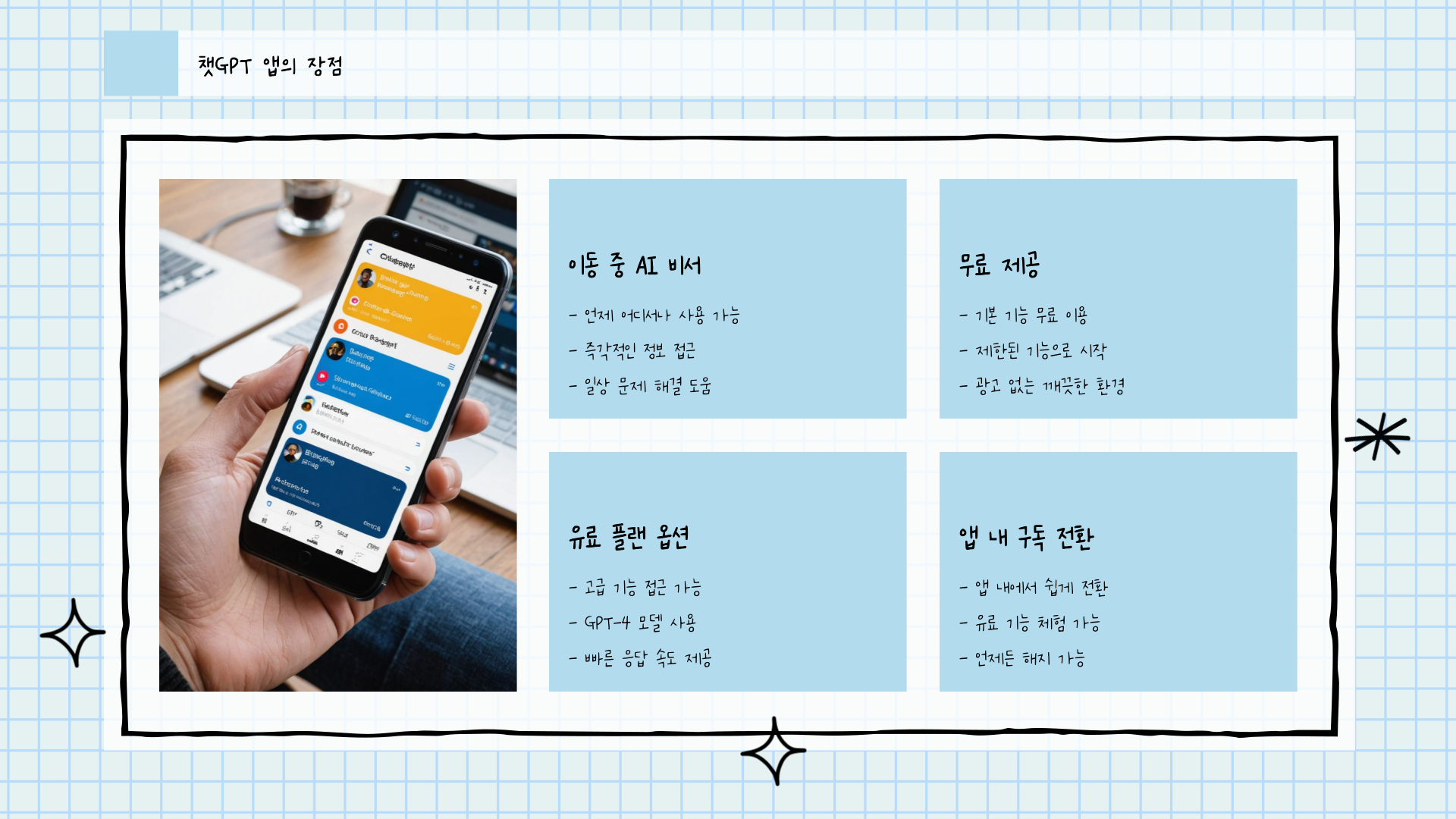 | 음성 입력 활용 | 스마트폰 마이크로 질문을 말로 입력해 더 편리하게 사용 | 손이 자유로워져 멀티태스킹에 유리 |