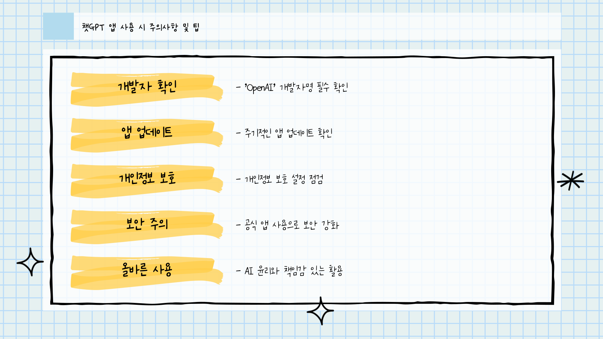 - 마지막으로, 챗gpt를 통해 받은 정보나 문서를 외부에 공유할 때는, 개인정보가 포함되어 있지 않은지 반드시 확인해야 해요. 저도 업무상 받은 답변을 팀원들과 공유할 때, 민감한 내용이 없는지 한 번 더 점검하고 있습니다.