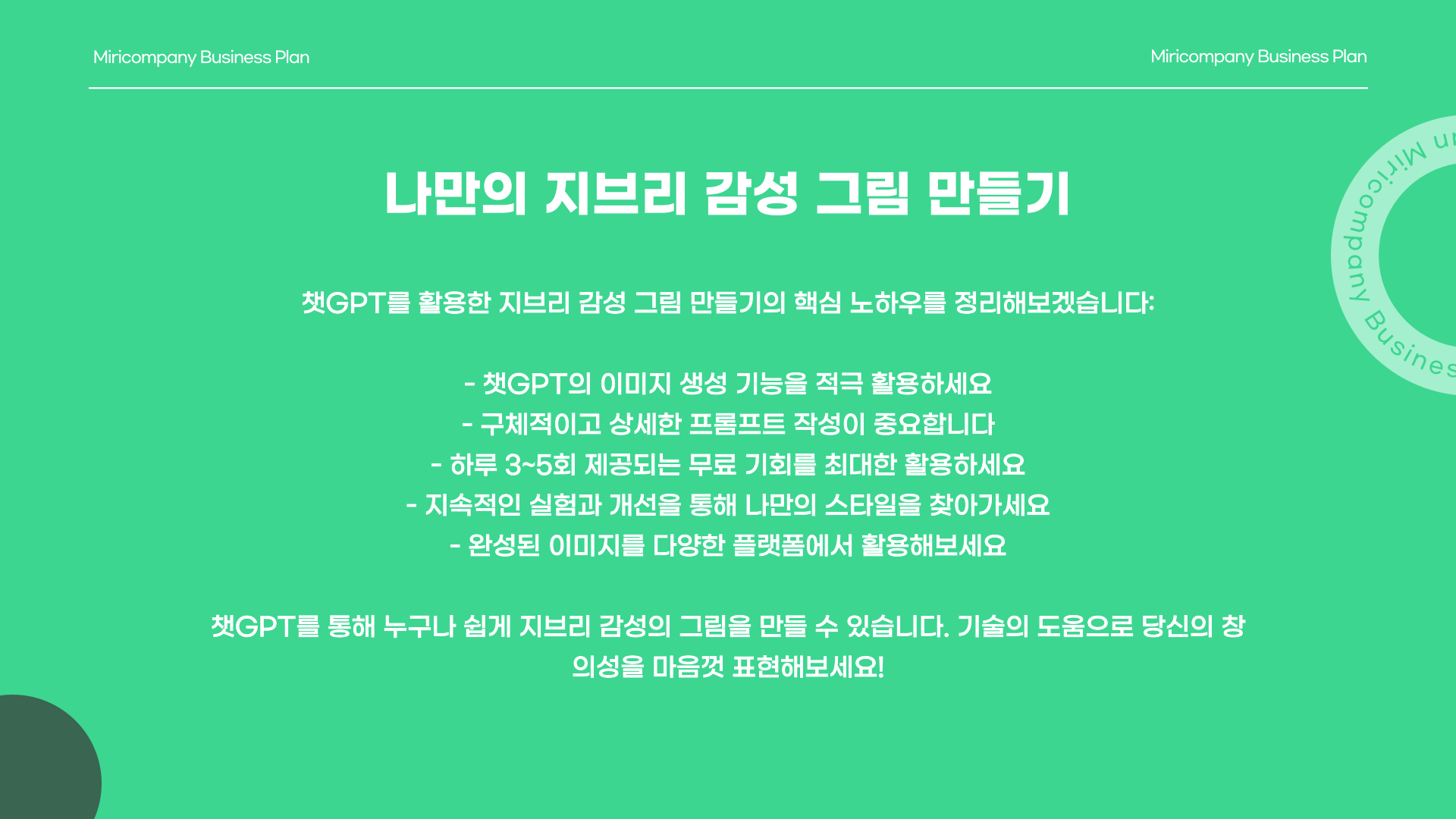 이제 망설이지 말고, 오늘 바로 챗GPT로 나만의 지브리 세계를 시작해보세요. 직접 만든 이미지는 특별한 추억이 되고, 새로운 창작의 즐거움도 느낄 수 있을 거예요.