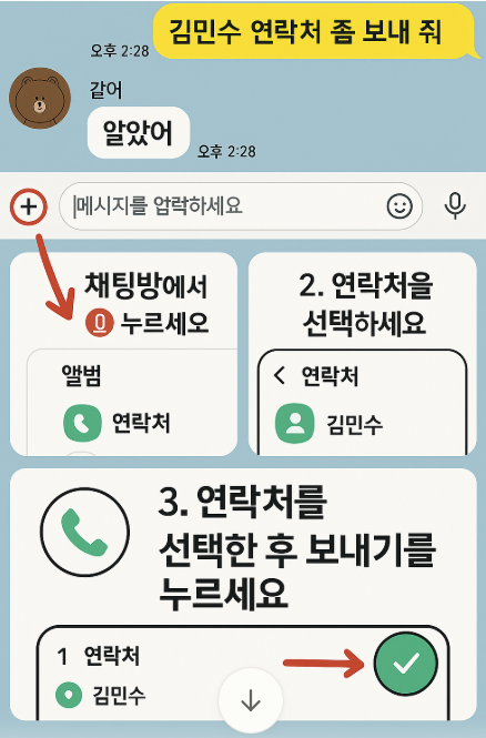 카톡 채팅방에서 왼쪽 아래 '+' 버튼을 누르고 '연락처'를 선택하세요. 그러면 내 휴대폰에 저장된 연락처 목록이 나타날 거예요. 보내고 싶은 연락처를 선택하고 전송하면, 상대방은 그 연락처를 바로 휴대폰에 저장할 수 있답니다. 정말 편리하죠?