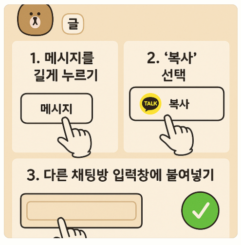 - ‘복사’를 선택했다면, 원하는 채팅방에 들어가서 입력창을 길게 눌러 붙여넣기 후 전송하세요.