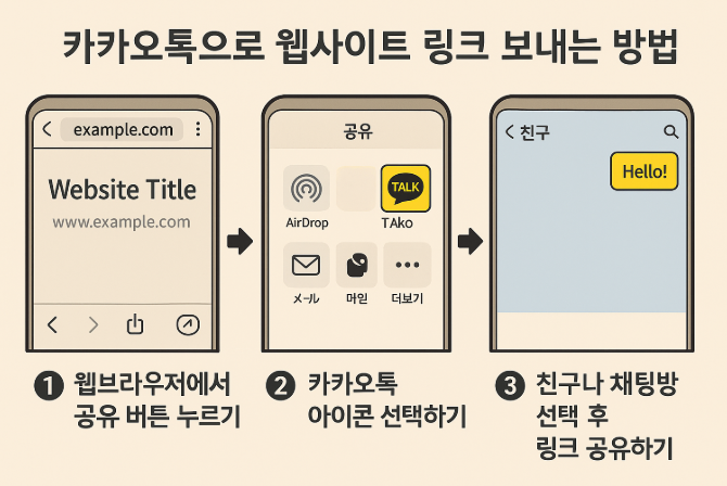 대부분의 웹브라우저(예: 크롬, 사파리)에는 '공유' 버튼이 있어요. 웹사이트를 보고 있다가 화면 아래나 위에 있는 '공유' 아이콘(보통 화살표가 위로 향하거나 점 세 개로 표시)을 누르면 카카오톡 아이콘이 보일 거예요. 그 카카오톡 아이콘을 누르고 보내고 싶은 친구나 채팅방을 선택하면 바로 링크가 깔끔하게 공유된답니다.