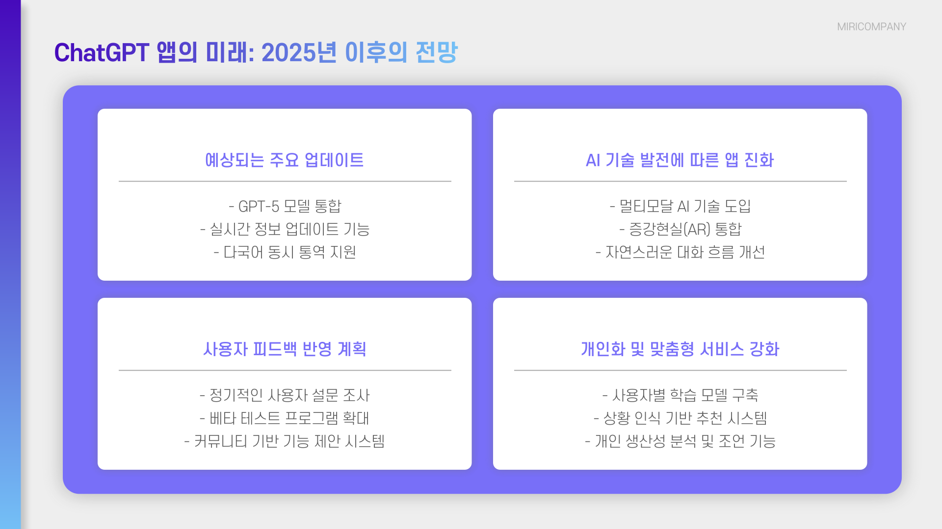 - 마지막으로, 챗 gpt 어플의 이미지 생성 기능은 꾸준히 업데이트되고 있어요. 새로운 스타일, 고해상도 옵션, 다양한 프롬프트 지원 등 앞으로 더 많은 기능이 추가될 예정이니, 최신 버전으로 앱을 유지하는 것도 중요해요.